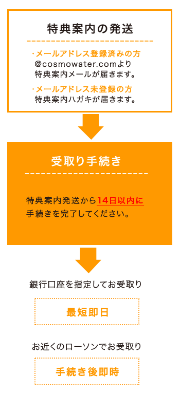 株式会社コスモライフより、特典の受取り案内を「メール」もしくはご登録のご住所に「ハガキ」でお届けいたします。